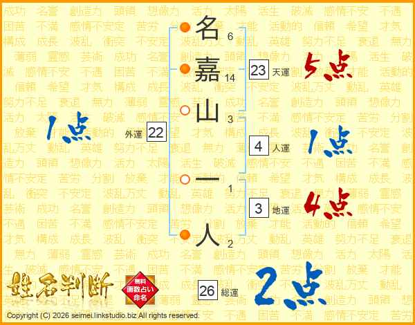 名嘉山一人さんの総運は26画の2点!