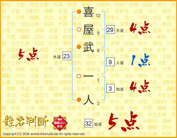 喜(12画)屋(9画)武(8画) 一(1画)人(2画)