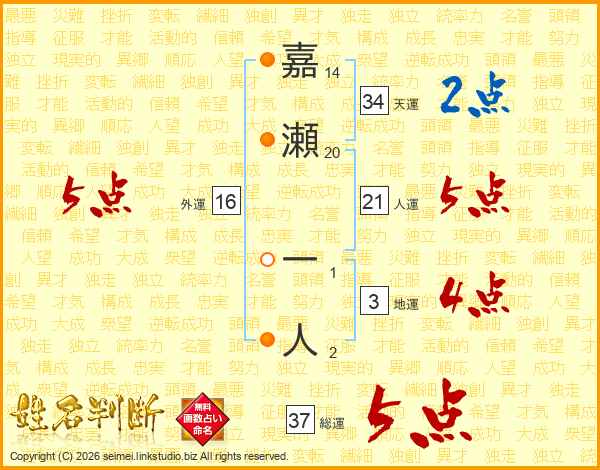 嘉瀬一人さんの総運は37画の5点!