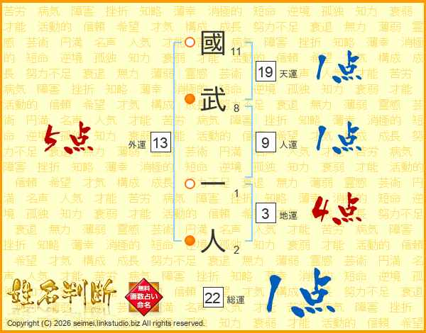 あなたの人生を表す1番重要な運勢です。生涯を通じて影響する総合運となり、主に50歳以降の晩年期に影響を及ぼします。苗字と名前の合計画数。