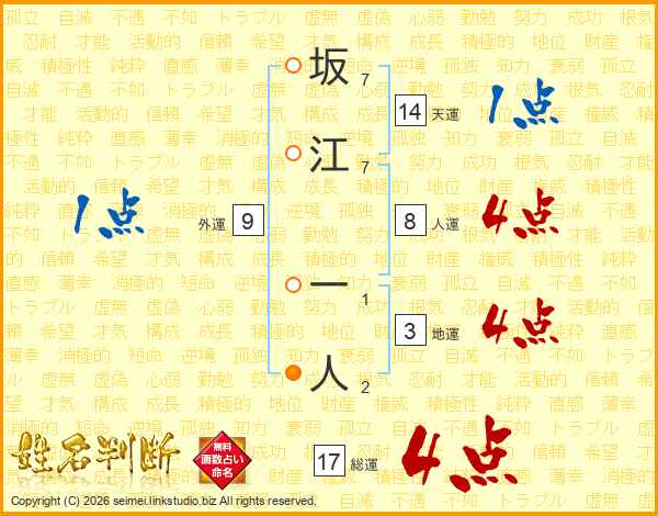 生活面を象徴する運勢です。外部から受ける影響力を表し、結婚運、家庭運や職場、環境への順応性を表します。総運から人運を引いた画数。姓や名が1文字の場合を除く。