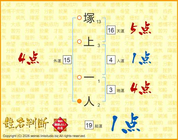 生活面を象徴する運勢です。外部から受ける影響力を表し、結婚運、家庭運や職場、環境への順応性を表します。総運から人運を引いた画数。姓や名が1文字の場合を除く。