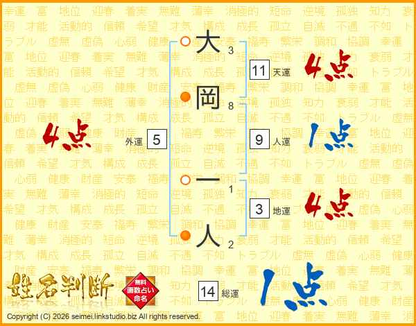 生活面を象徴する運勢です。外部から受ける影響力を表し、結婚運、家庭運や職場、環境への順応性を表します。総運から人運を引いた画数。姓や名が1文字の場合を除く。