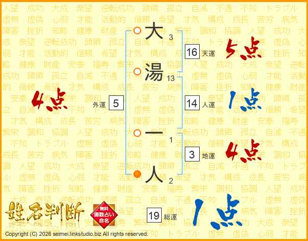 生活面を象徴する運勢です。外部から受ける影響力を表し、結婚運、家庭運や職場、環境への順応性を表します。総運から人運を引いた画数。姓や名が1文字の場合を除く。