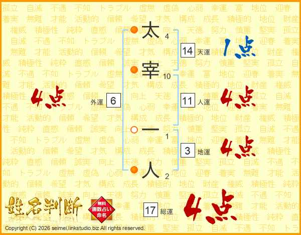 生活面を象徴する運勢です。外部から受ける影響力を表し、結婚運、家庭運や職場、環境への順応性を表します。総運から人運を引いた画数。姓や名が1文字の場合を除く。