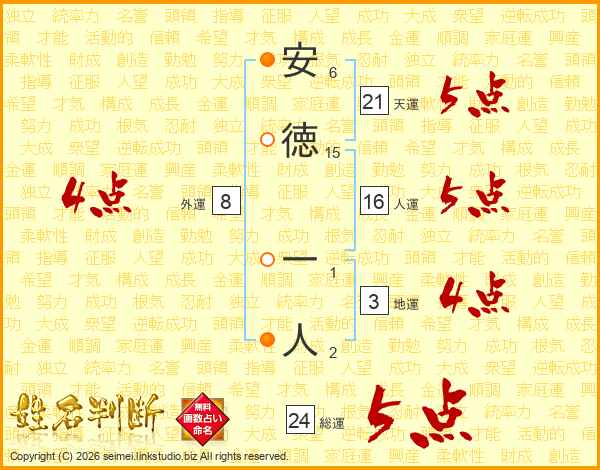 あなたの人生を表す1番重要な運勢です。生涯を通じて影響する総合運となり、主に50歳以降の晩年期に影響を及ぼします。苗字と名前の合計画数。