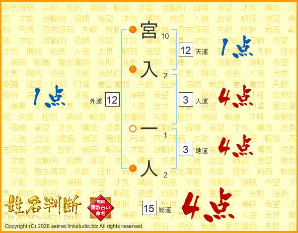 生活面を象徴する運勢です。外部から受ける影響力を表し、結婚運、家庭運や職場、環境への順応性を表します。総運から人運を引いた画数。姓や名が1文字の場合を除く。