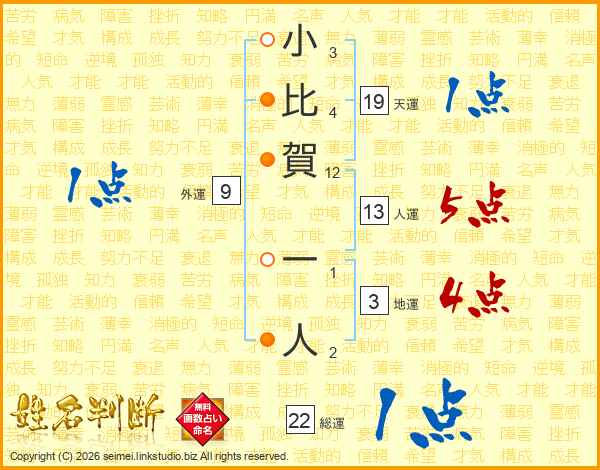 小比賀一人さんの総運は22画の1点!