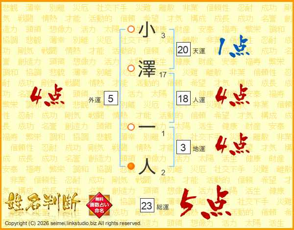 小澤一人さんの総運は23画の5点!