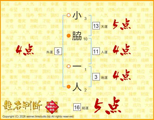 あなたの人生を表す1番重要な運勢です。生涯を通じて影響する総合運となり、主に50歳以降の晩年期に影響を及ぼします。苗字と名前の合計画数。