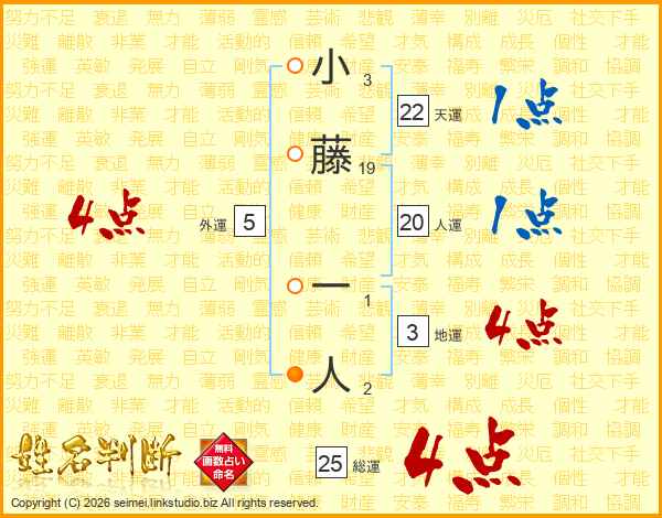 生活面を象徴する運勢です。外部から受ける影響力を表し、結婚運、家庭運や職場、環境への順応性を表します。総運から人運を引いた画数。姓や名が1文字の場合を除く。