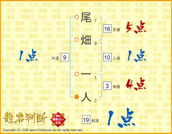 生活面を象徴する運勢です。外部から受ける影響力を表し、結婚運、家庭運や職場、環境への順応性を表します。総運から人運を引いた画数。姓や名が1文字の場合を除く。