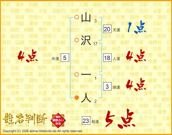 生活面を象徴する運勢です。外部から受ける影響力を表し、結婚運、家庭運や職場、環境への順応性を表します。総運から人運を引いた画数。姓や名が1文字の場合を除く。