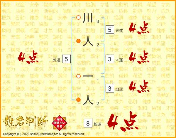 生活面を象徴する運勢です。外部から受ける影響力を表し、結婚運、家庭運や職場、環境への順応性を表します。総運から人運を引いた画数。姓や名が1文字の場合を除く。