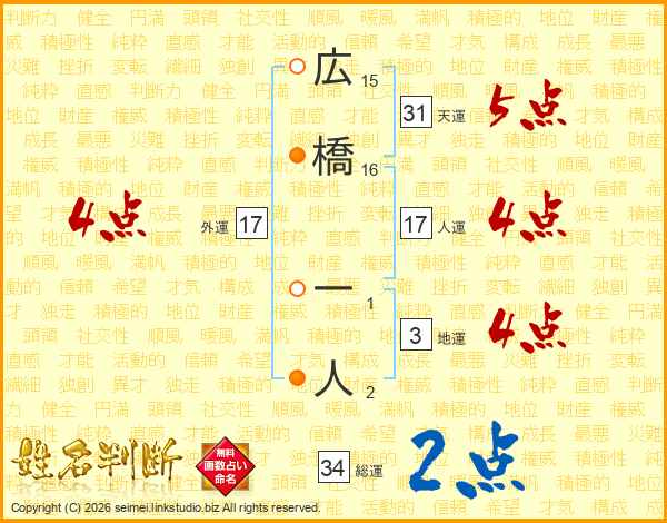 広橋一人さんの総運は34画の2点!