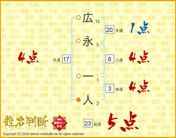 生活面を象徴する運勢です。外部から受ける影響力を表し、結婚運、家庭運や職場、環境への順応性を表します。総運から人運を引いた画数。姓や名が1文字の場合を除く。