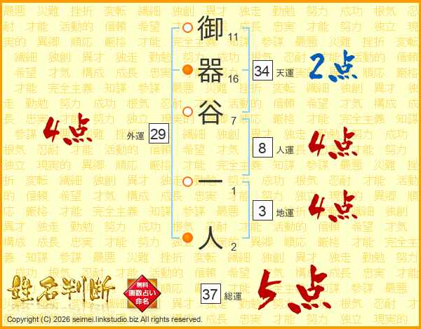 御器谷一人さんの総運は37画の5点!