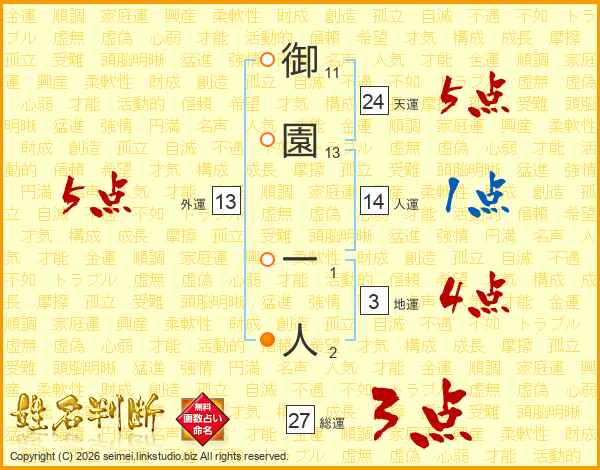 御園一人さんの総運は27画の3点!