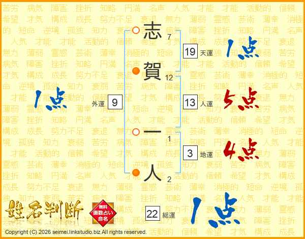 あなたの人生を表す1番重要な運勢です。生涯を通じて影響する総合運となり、主に50歳以降の晩年期に影響を及ぼします。苗字と名前の合計画数。