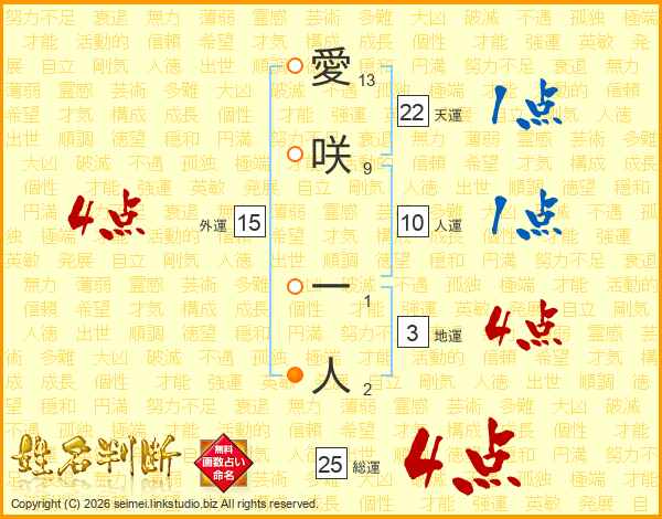 愛咲一人さんの総運は25画の4点!