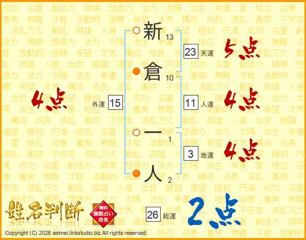 新倉一人さんの総運は26画の2点!