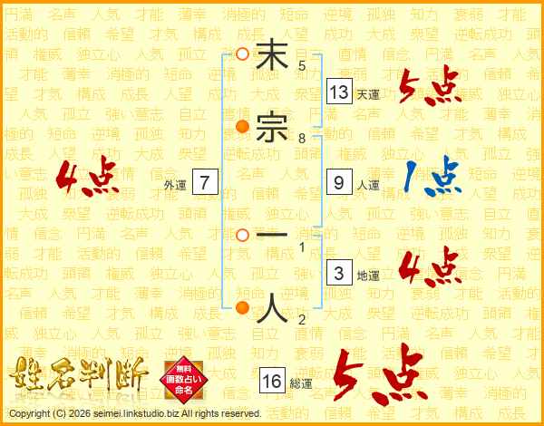 末宗一人さんの天運は13画の5点!