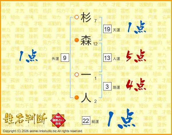 杉森一人さんの人運は13画の5点!