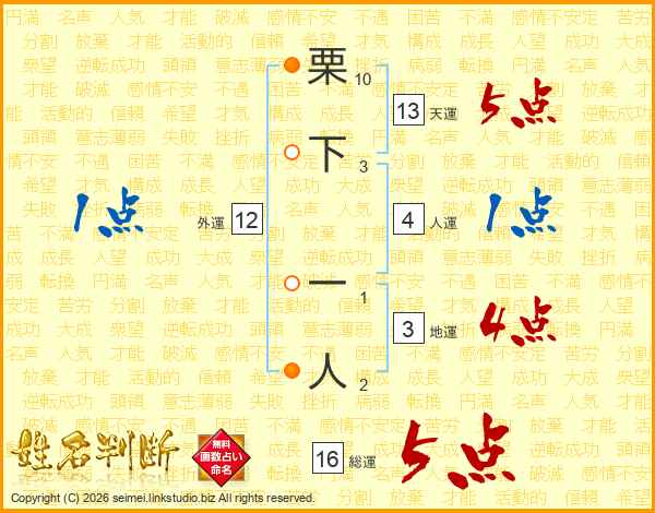 生活面を象徴する運勢です。外部から受ける影響力を表し、結婚運、家庭運や職場、環境への順応性を表します。総運から人運を引いた画数。姓や名が1文字の場合を除く。