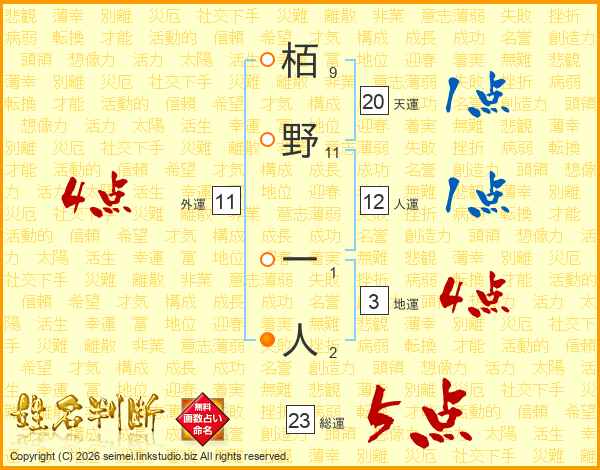 栢野一人さんの総運は23画の5点!