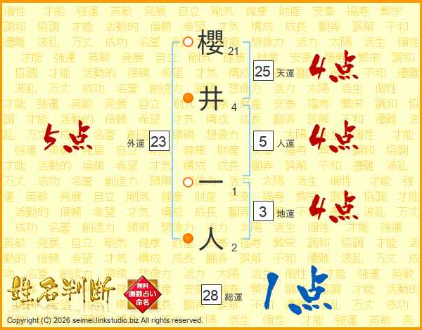 あなたの人生を表す1番重要な運勢です。生涯を通じて影響する総合運となり、主に50歳以降の晩年期に影響を及ぼします。苗字と名前の合計画数。