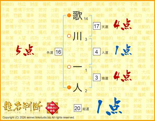 歌川一人さんの天運は17画の4点!