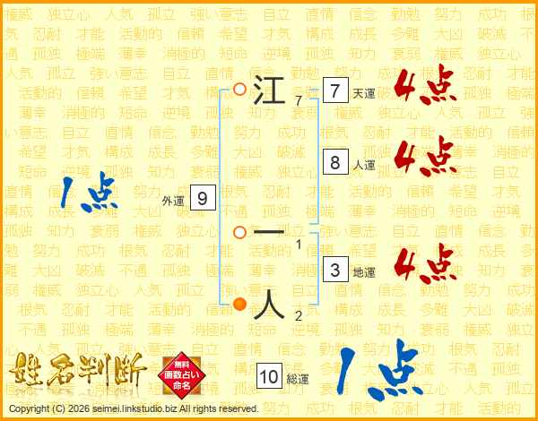 生活面を象徴する運勢です。外部から受ける影響力を表し、結婚運、家庭運や職場、環境への順応性を表します。総運から人運を引いた画数。姓や名が1文字の場合を除く。