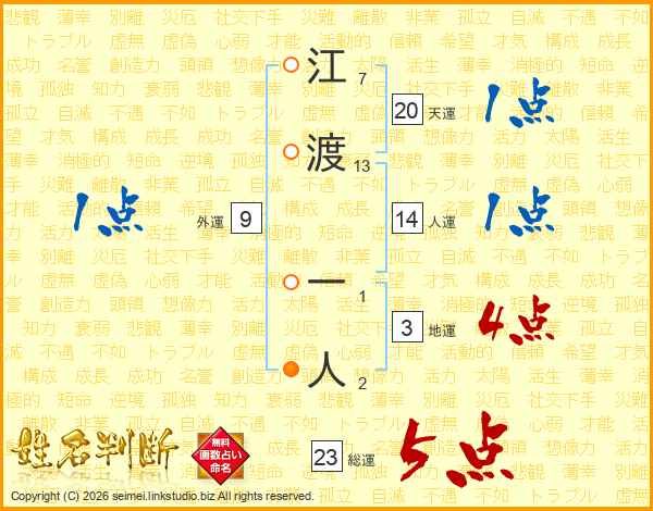 生活面を象徴する運勢です。外部から受ける影響力を表し、結婚運、家庭運や職場、環境への順応性を表します。総運から人運を引いた画数。姓や名が1文字の場合を除く。