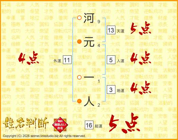 あなたの人生を表す1番重要な運勢です。生涯を通じて影響する総合運となり、主に50歳以降の晩年期に影響を及ぼします。苗字と名前の合計画数。