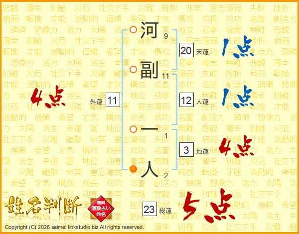 生活面を象徴する運勢です。外部から受ける影響力を表し、結婚運、家庭運や職場、環境への順応性を表します。総運から人運を引いた画数。姓や名が1文字の場合を除く。