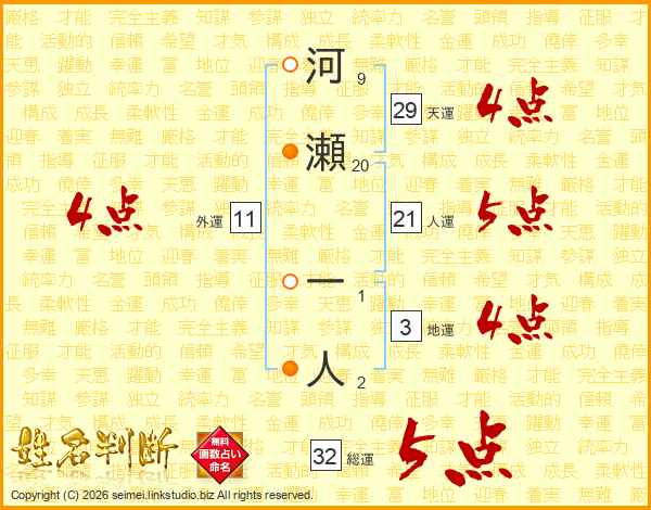 河瀬一人さんの総運は32画の5点!