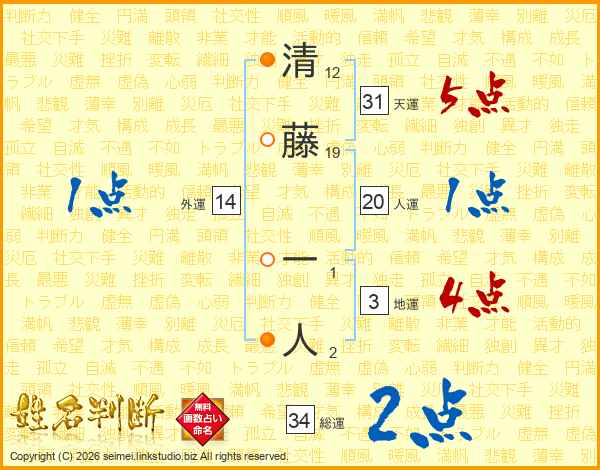 あなたの人生を表す1番重要な運勢です。生涯を通じて影響する総合運となり、主に50歳以降の晩年期に影響を及ぼします。苗字と名前の合計画数。