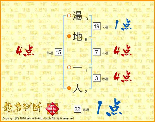生活面を象徴する運勢です。外部から受ける影響力を表し、結婚運、家庭運や職場、環境への順応性を表します。総運から人運を引いた画数。姓や名が1文字の場合を除く。