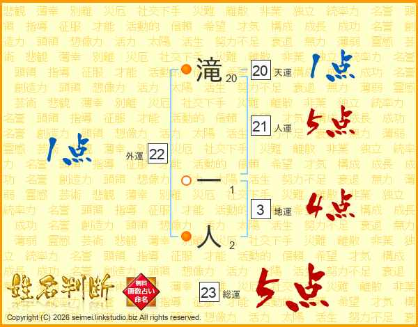 あなたの人生を表す1番重要な運勢です。生涯を通じて影響する総合運となり、主に50歳以降の晩年期に影響を及ぼします。苗字と名前の合計画数。