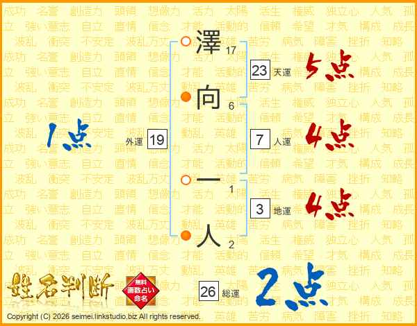 生活面を象徴する運勢です。外部から受ける影響力を表し、結婚運、家庭運や職場、環境への順応性を表します。総運から人運を引いた画数。姓や名が1文字の場合を除く。