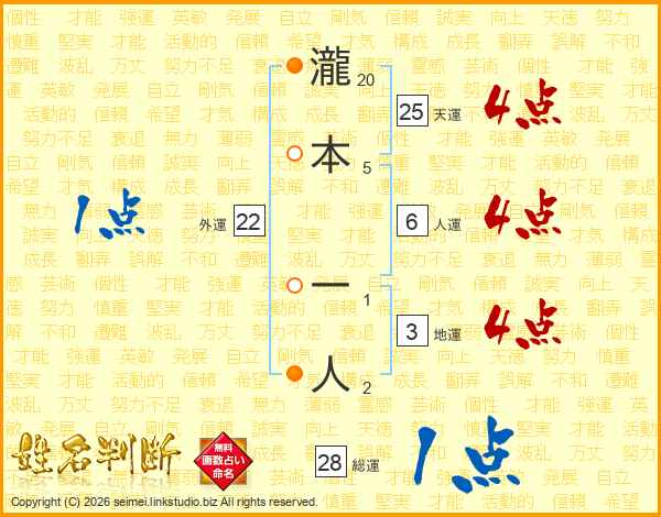 あなたの人生を表す1番重要な運勢です。生涯を通じて影響する総合運となり、主に50歳以降の晩年期に影響を及ぼします。苗字と名前の合計画数。