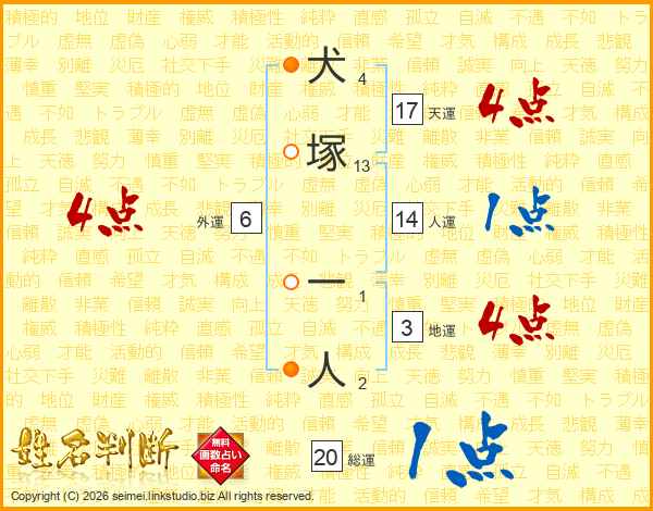 生活面を象徴する運勢です。外部から受ける影響力を表し、結婚運、家庭運や職場、環境への順応性を表します。総運から人運を引いた画数。姓や名が1文字の場合を除く。