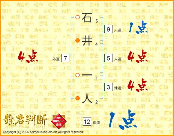 生活面を象徴する運勢です。外部から受ける影響力を表し、結婚運、家庭運や職場、環境への順応性を表します。総運から人運を引いた画数。姓や名が1文字の場合を除く。