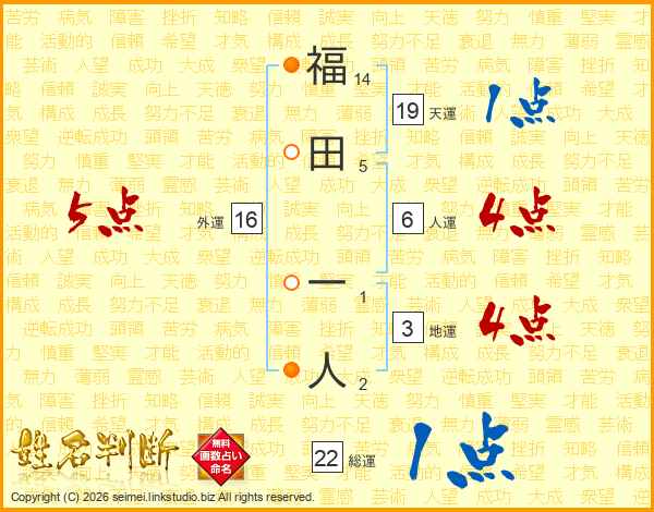 生活面を象徴する運勢です。外部から受ける影響力を表し、結婚運、家庭運や職場、環境への順応性を表します。総運から人運を引いた画数。姓や名が1文字の場合を除く。
