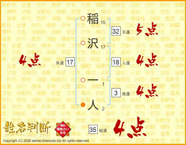 稲沢一人さんの天運は32画の5点!