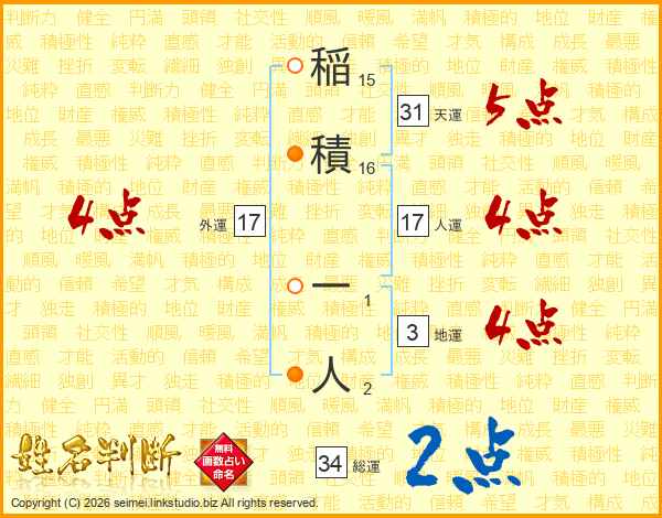 稲積一人さんの総運は34画の2点!