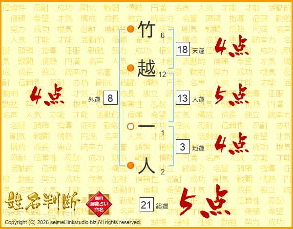 竹越一人さんの人運は13画の5点!
