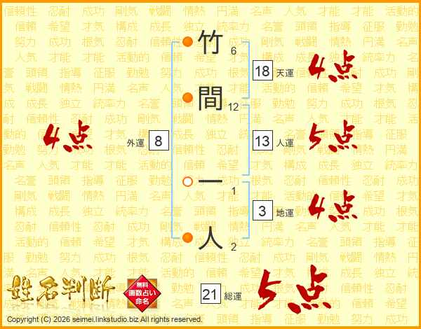 あなたの人生を表す1番重要な運勢です。生涯を通じて影響する総合運となり、主に50歳以降の晩年期に影響を及ぼします。苗字と名前の合計画数。