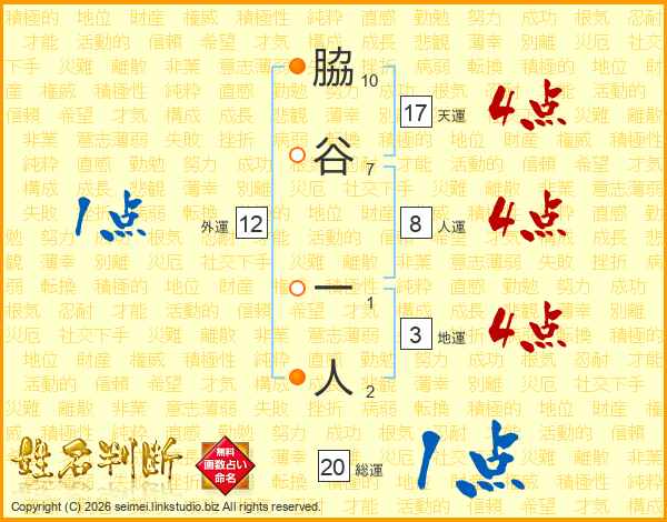 生活面を象徴する運勢です。外部から受ける影響力を表し、結婚運、家庭運や職場、環境への順応性を表します。総運から人運を引いた画数。姓や名が1文字の場合を除く。