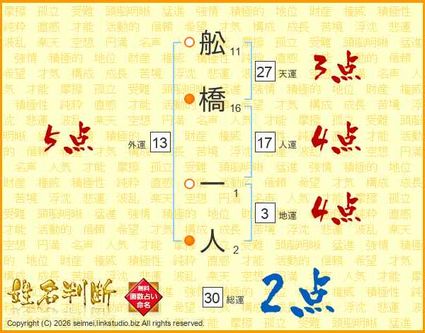 あなたの人生を表す1番重要な運勢です。生涯を通じて影響する総合運となり、主に50歳以降の晩年期に影響を及ぼします。苗字と名前の合計画数。
